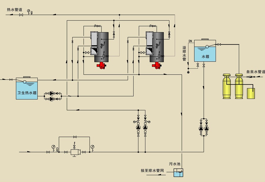锅炉采用了大炉膛和对流管束二回程设计,使烟气在炉膛内停留时间加长,可燃气体得到充分燃烧,提高了燃烧效率。炉膛与对流管束通过水冷壁分开,烟气型走向。高温烟气首先在炉膛内与水冷壁进行高效换热,避免了直接高温烟气直接冲刷锅筒,延长了锅炉的使用寿命;烟气在经后烟箱进入二回程对流管束,进一步散热;流经对流管束后,烟气离开锅炉本体,通过连接烟道进入尾部受热面(节能器等热回收装置),再进入烟囱排入大气。